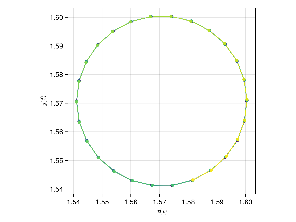 f_alt = Filaments.init(fcurve, ClosedFilament, N, QuinticSplineMethod())Note that this generates a filament which is practically identical to the previous one (just with a shift in the node positions, not really visible here):