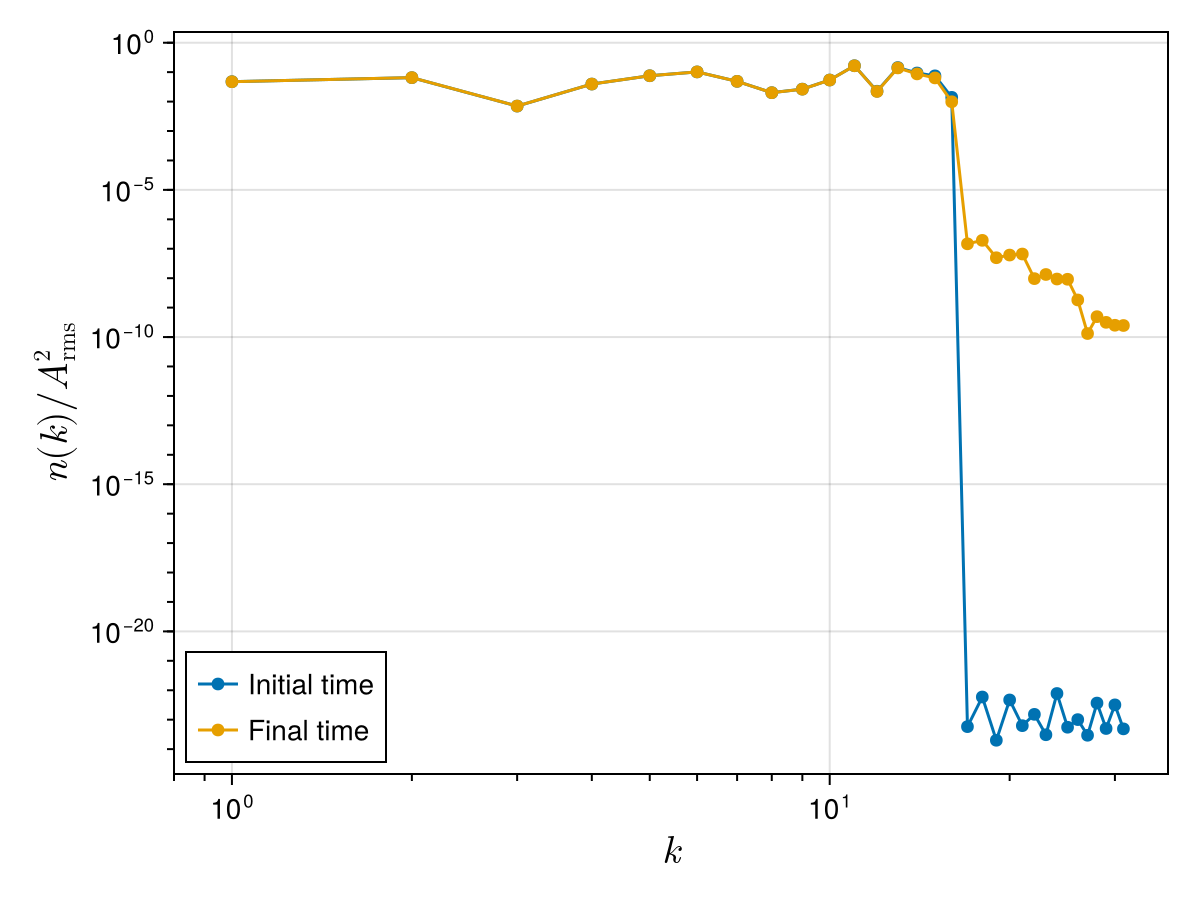 (energy[end] - energy[begin]) / energy[begin]-9.388086504966906e-11which can be explained by numerical dissipation at the smallest resolved scales. Notice that the spectrum gets populated at large wavenumbers, which is possibly due to the Kelvin wave cascade mechanism: