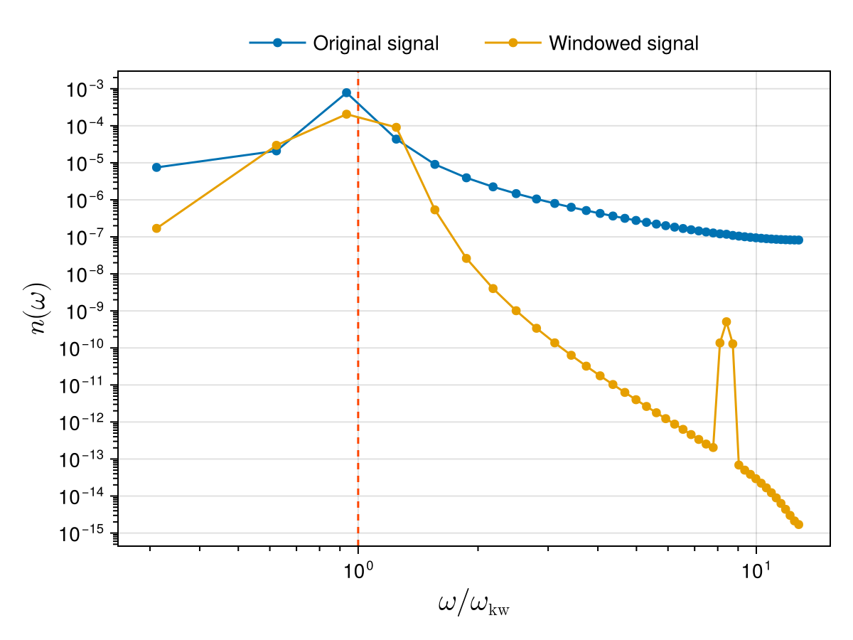 -4.68204e-6+2.39272e-6im -2.59868e-6-3.13459e-6imAs detailed in the Temporal analysis section, we apply a window function over the temporal dimension since the original signal is not exactly periodic in time: